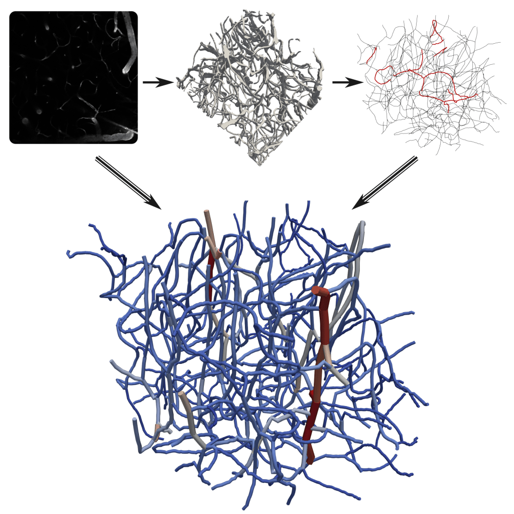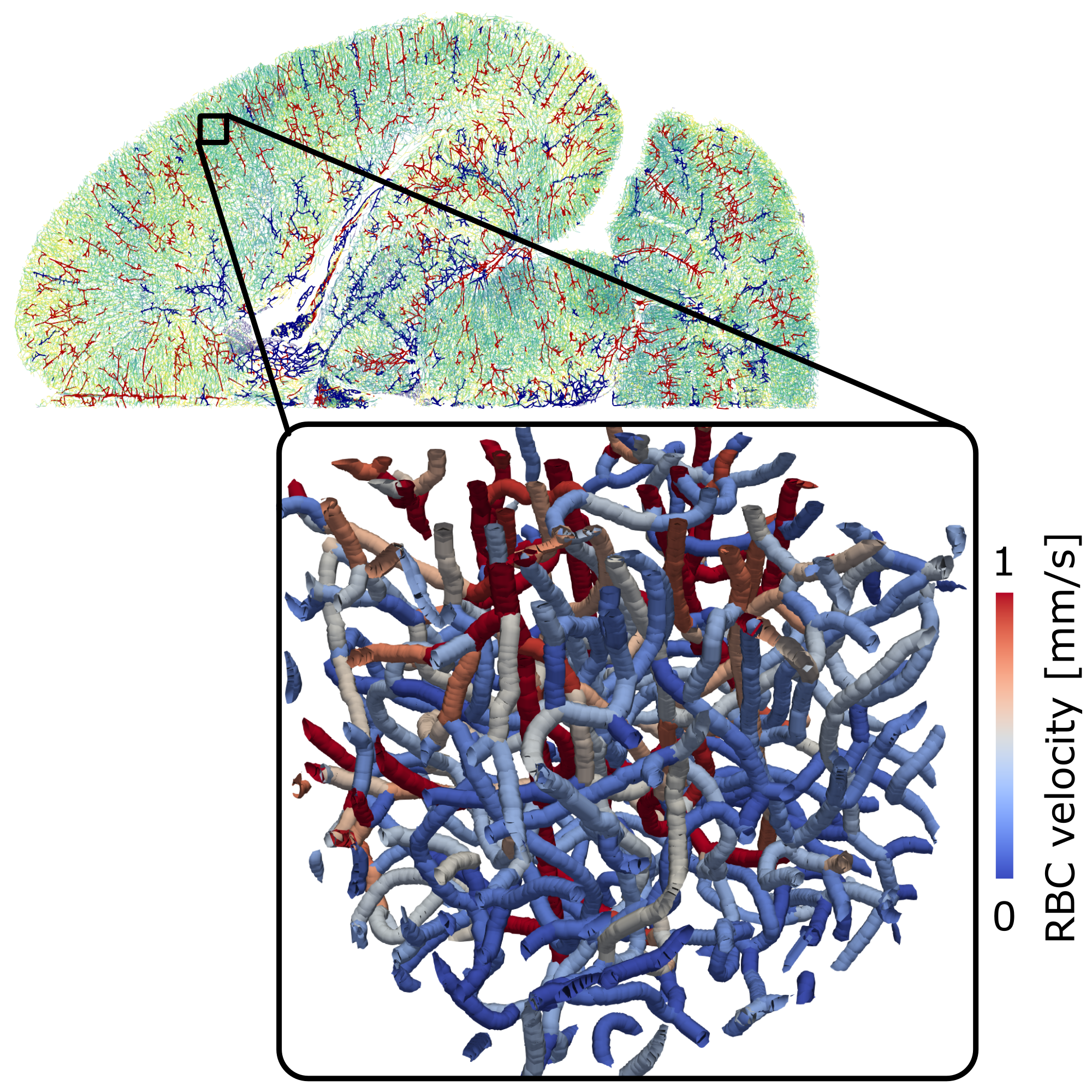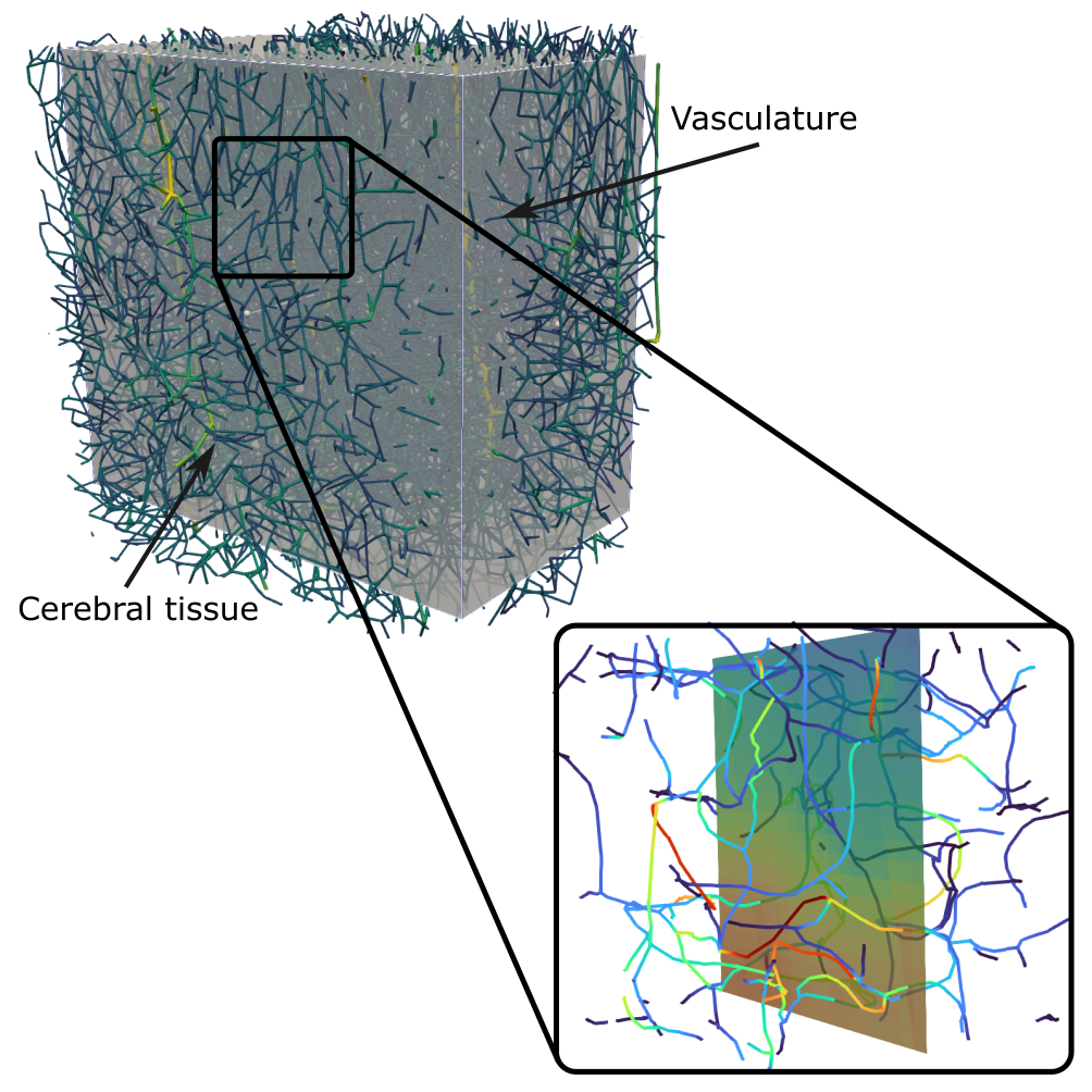 The vasculature of the brain is responsible for ensuring a robust blood supply during baseline and elevated neural activity. While arteries are responsible for the distribution of blood to all brain areas, the capillary bed is the key location for nutrient and oxygen discharge. We utilize in silico blood flow models in realistic microvascular networks to identify key characteristics of microvascular topology and perfusion. One of our specific interests lies in the impact of perfusion heterogeneity, which is a direct consequence of the bi-phasic nature of blood (plasma and red blood cells) and the intricate microvascular structure. Another key focus lies on brain area-specific differences in topology, perfusion, and regulation. This requires an accurate labeling of arteries and veins in vascular whole brain datasets and novel in silico models to describe up-regulation of flow during increased neuronal activity.